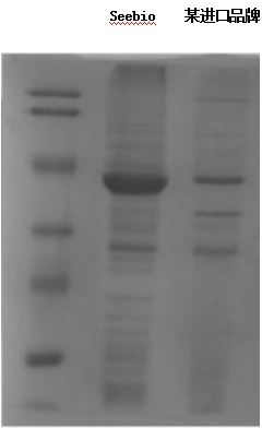 下圖數(shù)據(jù)為Seebio-21菌在不同培養(yǎng)基中的目標蛋白表達情況,泳道“Seebio”代表培養(yǎng)基中添加Seebio品牌胰蛋白胨+酵母粉,泳道“某進口品牌”代表培養(yǎng)基中添加某進口品牌蛋白胨和酵母粉,通過SDS-PAGE電泳進行結果顯示,Seebio品牌胰蛋白胨+酵母粉組合表達效果優(yōu)于某進口品牌組合。