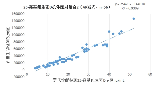 3.2.2西寶生物發(fā)光(AP)平臺(tái)25-羥基維生素D抗體配對(duì)組合2與羅氏診斷的25-羥基維生素D試劑(電化學(xué)發(fā)光法)賦值的臨床樣本相關(guān)性R2>0.90,相關(guān)性較好。
